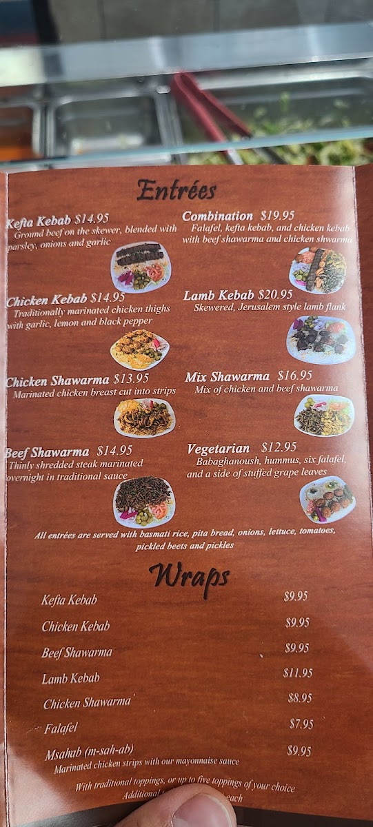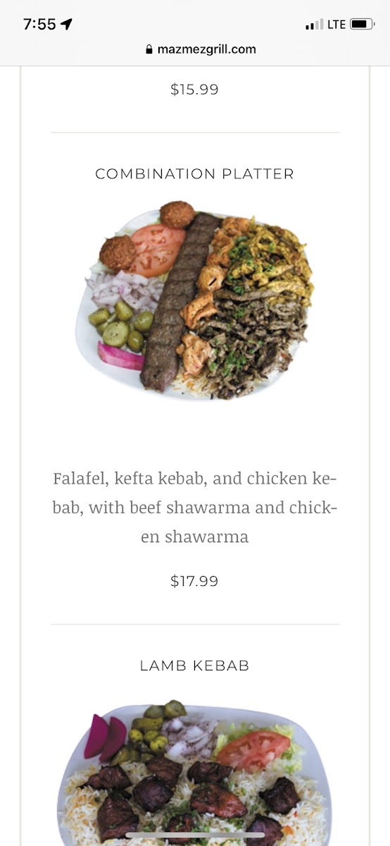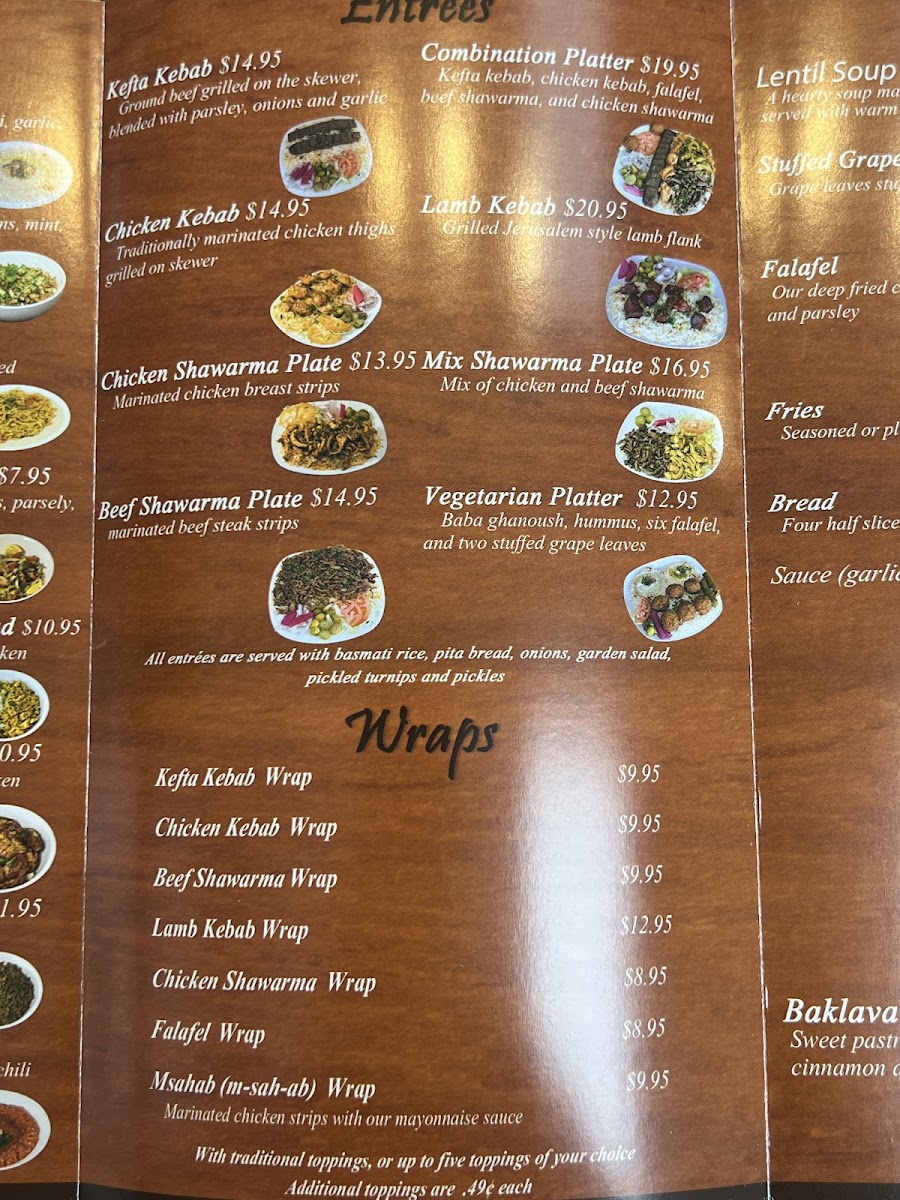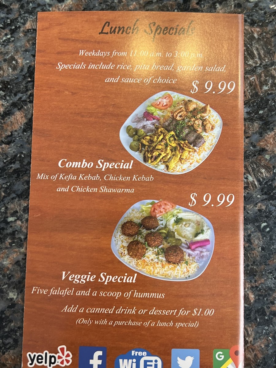 Kefta kebab, chicken kebab, falafel, beef shawarma, and chicken shwarma